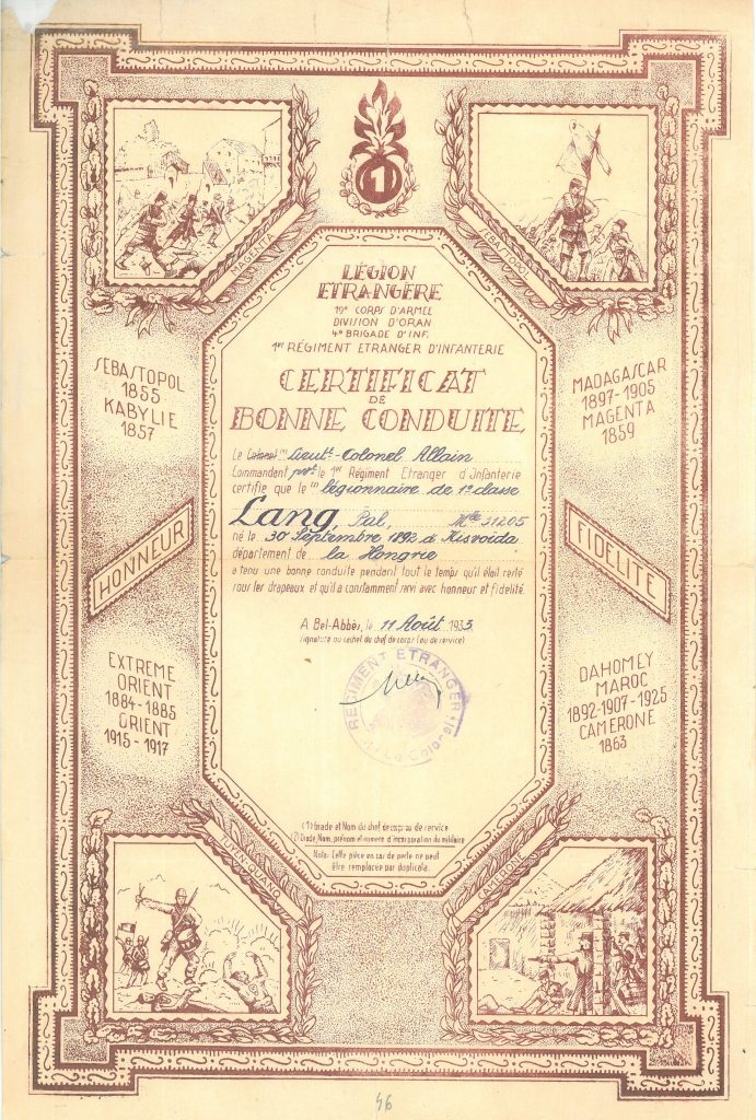 Dr. Láng Pál ügyvéd idegenlégiós bizonyítványa BFL Budapesti Ügyvédi Kamara iratai. Ügyvédi dossziék. (IX.282.b) 6377. Láng Pál (Lipót) (Kisvárda, 1892 ...